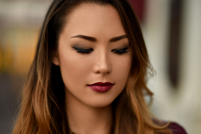 Here is look number two wearing Buxom's Bold Gel Lipstick in Sultry Mauve. What I love most about this subtle color is while it has a hint of purple, it is still great for everyday - even the office. As a general color rule, olive green is well complimented by purple but straight up purple lipstick is not so great! Buxom has all the most flattering shades in the reds, purples, nudes and pinks which is why I was still able to find the perfect shade of lipstick to match my skirt.