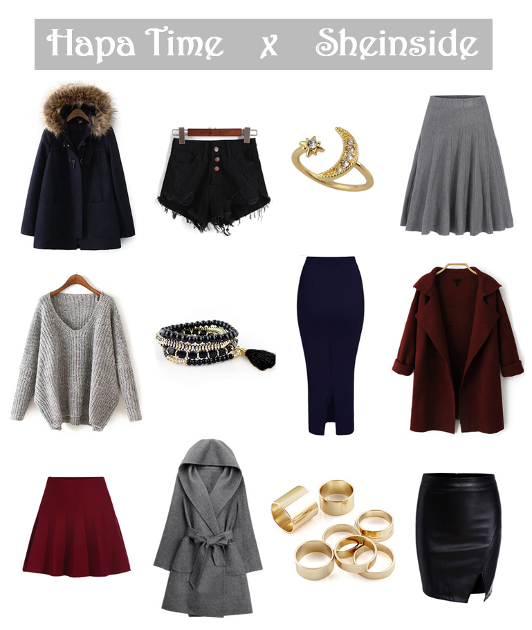 Row 1: Navy Coat, Black Shorts, Ring, Gray Skirt